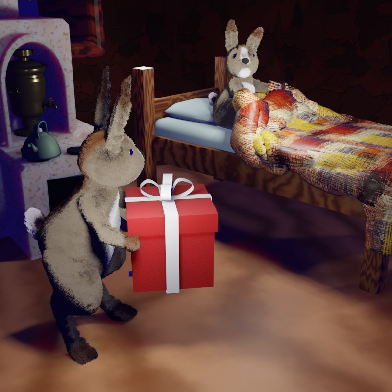 Тут на кухню вбежали другие зайчата. Все радостно уселись за стол и, гремя ложками, принялись за обед. После обеда снова пошли гулять на улицу, и Малыш немного забыл о дне рождения. Он радостно бегал и играл с другими зайчатами, играл в снежки и строил со всеми огромного снеговика. К вечеру стало холоднее, и папа позвал всех домой. После ужина долго читали сказки, пока зайчата не стали зевать, засыпая. Наконец, папа погасил свет и тоже пошёл спать.