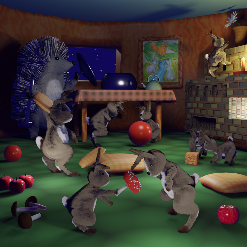 Обед прошёл мирно. Было слышно только, как зайцы чавкают салатом. Ёжик не ел. Он сидел в уголке на стуле и наслаждался тишиной. Иногда он поглядывал в маленькое окошко, не возвращается ли Заяц. На улице слегка потемнело, и пошел унылый, моросящий осенний дождь. Обед подходил к концу, и Ёжик уже подумывал, чем бы занять этих сорванцов, чтобы более или менее спокойно дожить до вечера.