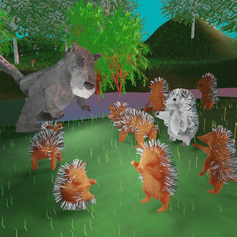 Заяц каким-то чудом увернулся от щёлкнувшей зубами пасти и кинулся в сторону реки. Вскоре повеяло прохладой и, выскочив из кустов, косой оказался на берегу. Заяц бежал очень быстро, поэтому он не успел удивиться, заметив, что весь берег от воды и до леса уставлен страшными колючими ёжиками, сердито хмурившими брови и скалившими зубы. Проскакав мимо них, Заяц добежал до воды, но дальше бежать было некуда.