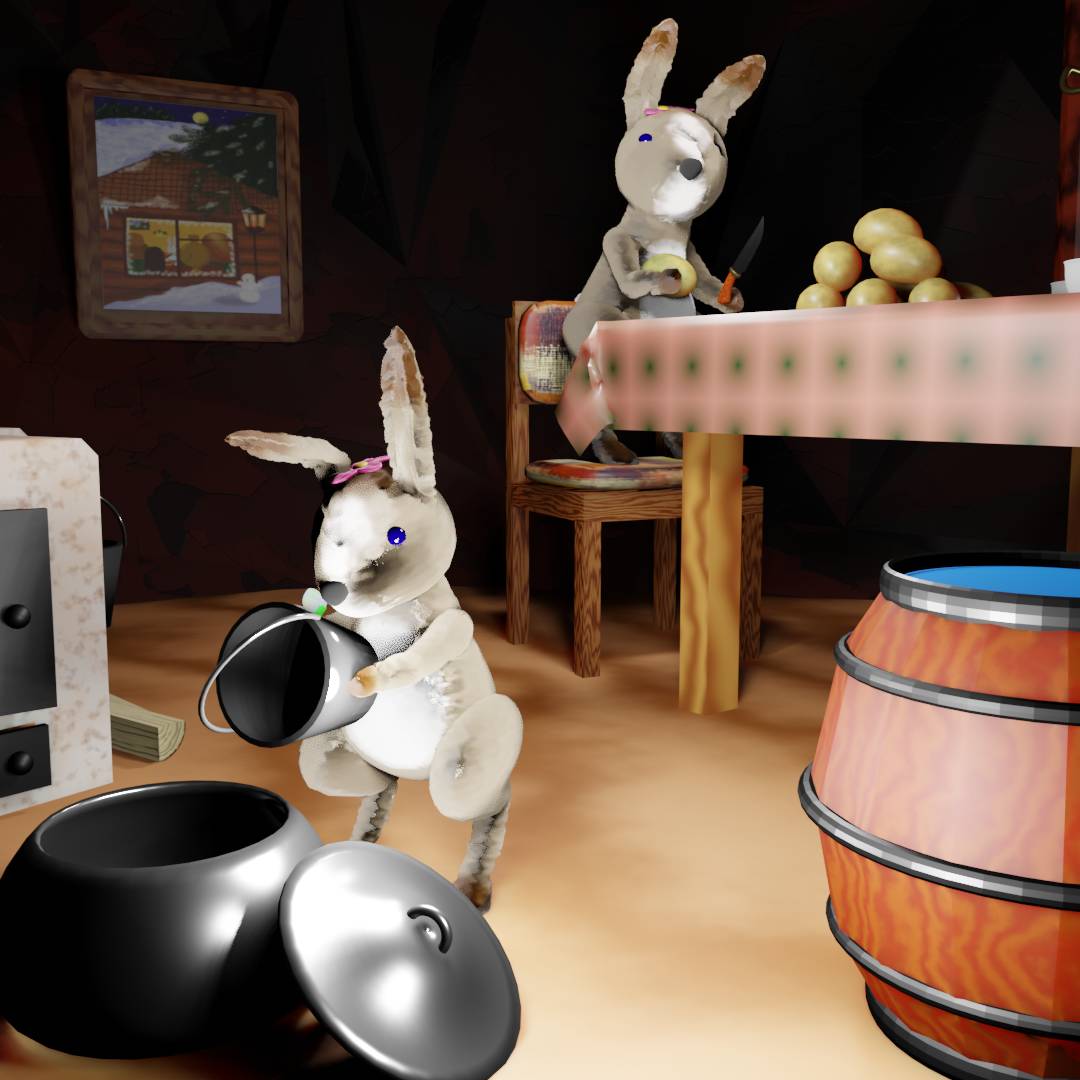 Зайчата принялись за работу. Картошка мыться не хотела. Она так и норовила выскользнуть из лап, но Фиалка не сдавалась. Вскоре на столе красовалась целая горка вымытой картошки. Двум картофелинам, правда, удалось всё-таки сбежать под шкаф, и девочки долго доставали их оттуда палкой. Наконец, все картофелины были отловлены, и Незабудка принялась за чистку.