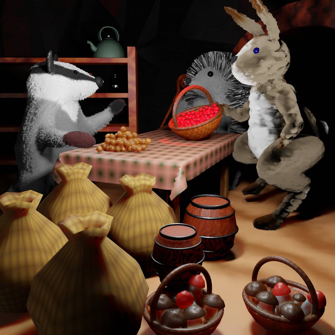 В раздумье Ёжик вернулся домой. Он всё гадал, Белка просто так хотела его угостить кедровыми орешками или тоже хочет поменяться на мешок грибов. Наконец, он решил, что просто так. Только Барсук никогда ничего не делал просто так в лесу, а остальные звери всегда делились друг с другом, если было что-то лишнее.