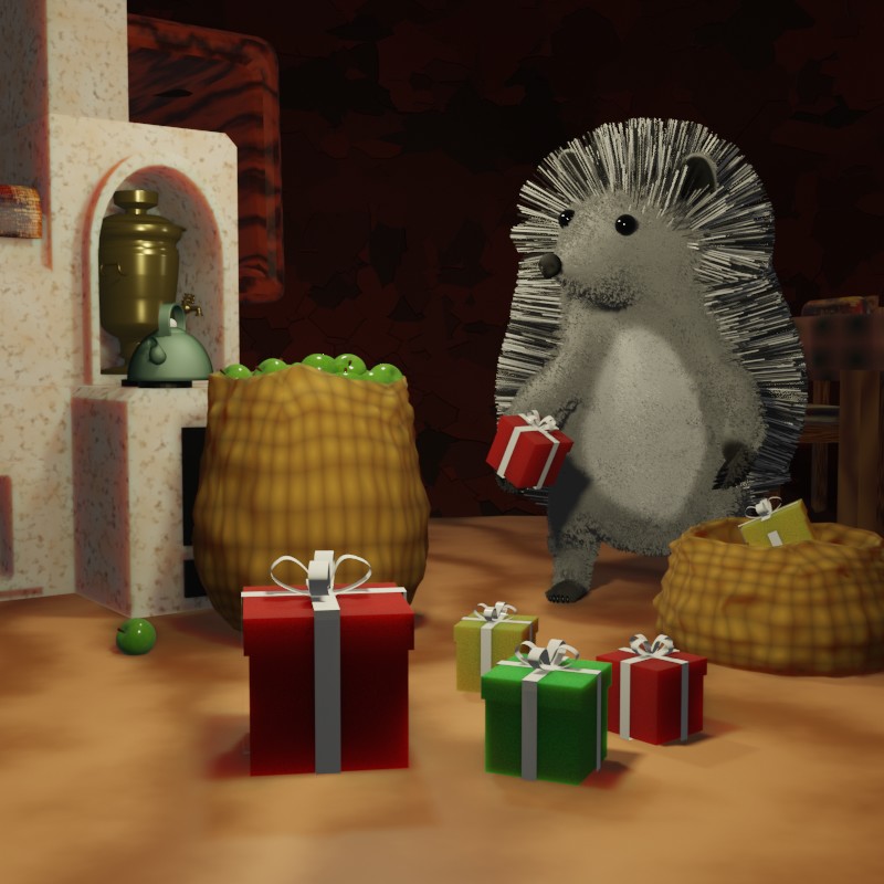 Наступил вечер. Спохватившись, Ёжик принялся упаковывать подарки. Он достал мешок, цветную бумагу и стал делать из неё кулёчки, в которые клал подарки: орехи, сушеную землянику, малину и другие ягоды. Ёжик старался, чтобы в каждом подарке было как можно больше разных гостинцев, ведь так гораздо интересней будет их получать. Также он старался сделать так, чтобы подарки не были одинаковыми, чтобы для каждого зайчонка был какой-нибудь сюрприз. В один кулёк Ёжик, подумав, положил большой мешочек с сушеной перечной мятой и подписал: «Зайцу». Это было очень редкое растение, и Заяц очень любил чай с мятой. Этим летом Ёжик нашёл полянку, где он смог нарвать и насушить совсем немного мяты для друга. Наконец, все подарки были упакованы и сложены в мешок. Осталось только их подарить. Но как же быть с Дедом Морозом? Зайчата очень хотели, чтобы он пришёл к ним на праздник. Ёжик посидел немного, размышляя, но так ничего и не придумал. Ему очень хотелось порадовать малышей, но не хотелось поступать так, как советовали ему Барсук или Енот.