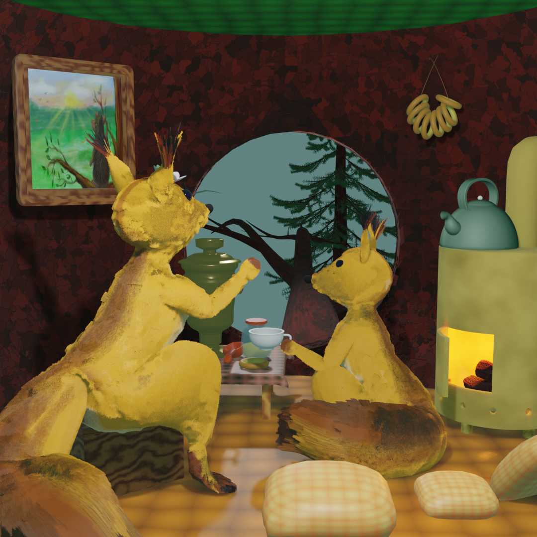 Белочка села на пол у печки. Бабушка поставила на стол самовар, баранки и варенье, разлила чай и села рядом.