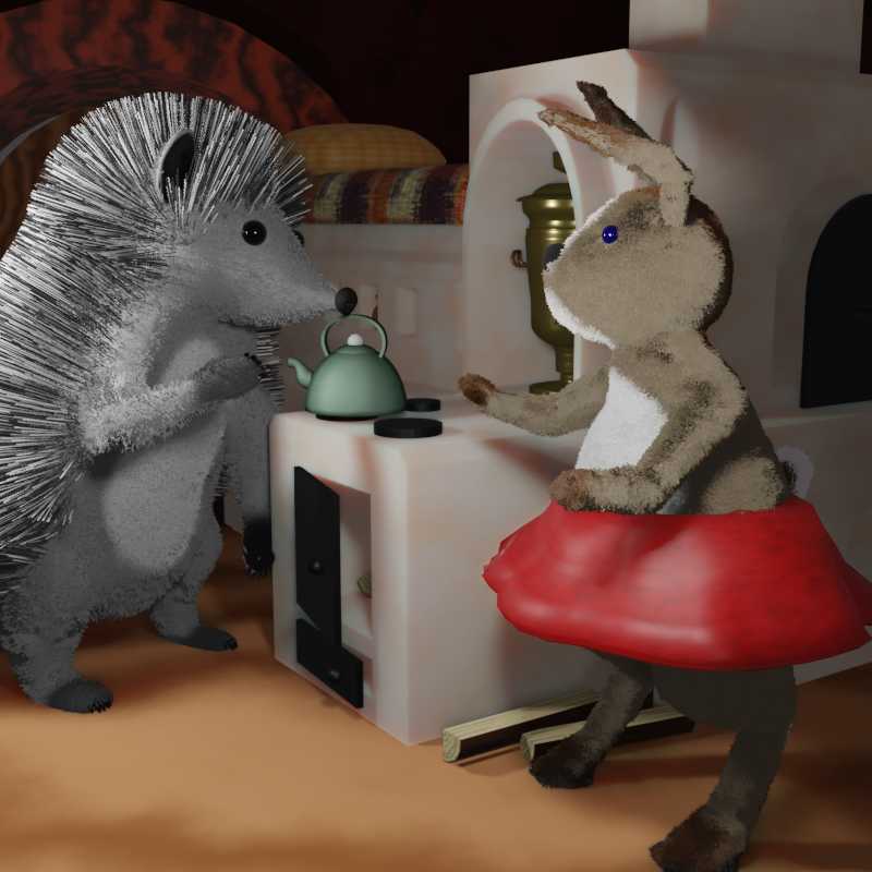 Заяц жил недалеко, но Ёжику не повезло застать его дома. Обычно осенью Заяц целыми днями был занят заготовкой запасов на зиму для своего семейства. Зато дома оказалась жена Зайца – Ромашка.
