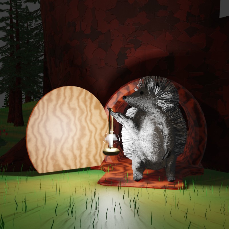 Захватив дудочку и фонарь, Ёжик быстро выбежал на улицу. Ему очень хотелось увидеть эту необычную райскую птицу и послушать вблизи её пение. Сначала он шёл быстро. Мелодия раздавалась с той же поляны, где Ёжик был днем. Вскоре стало видно какое-то свечение. Ёжик притушил свой фонарик и пошёл медленней. Он не хотел спугнуть птичку. Вскоре он выбрался на полянку со сломанным деревом. На полянке перед разломанным пнем сидел Медведь. Он аккуратно дёргал за щепки, те дребезжали, отчего по лесу разливалась такая необычная мелодия. Ёжик не хотел шуметь, но скрыть удивление он не сумел: