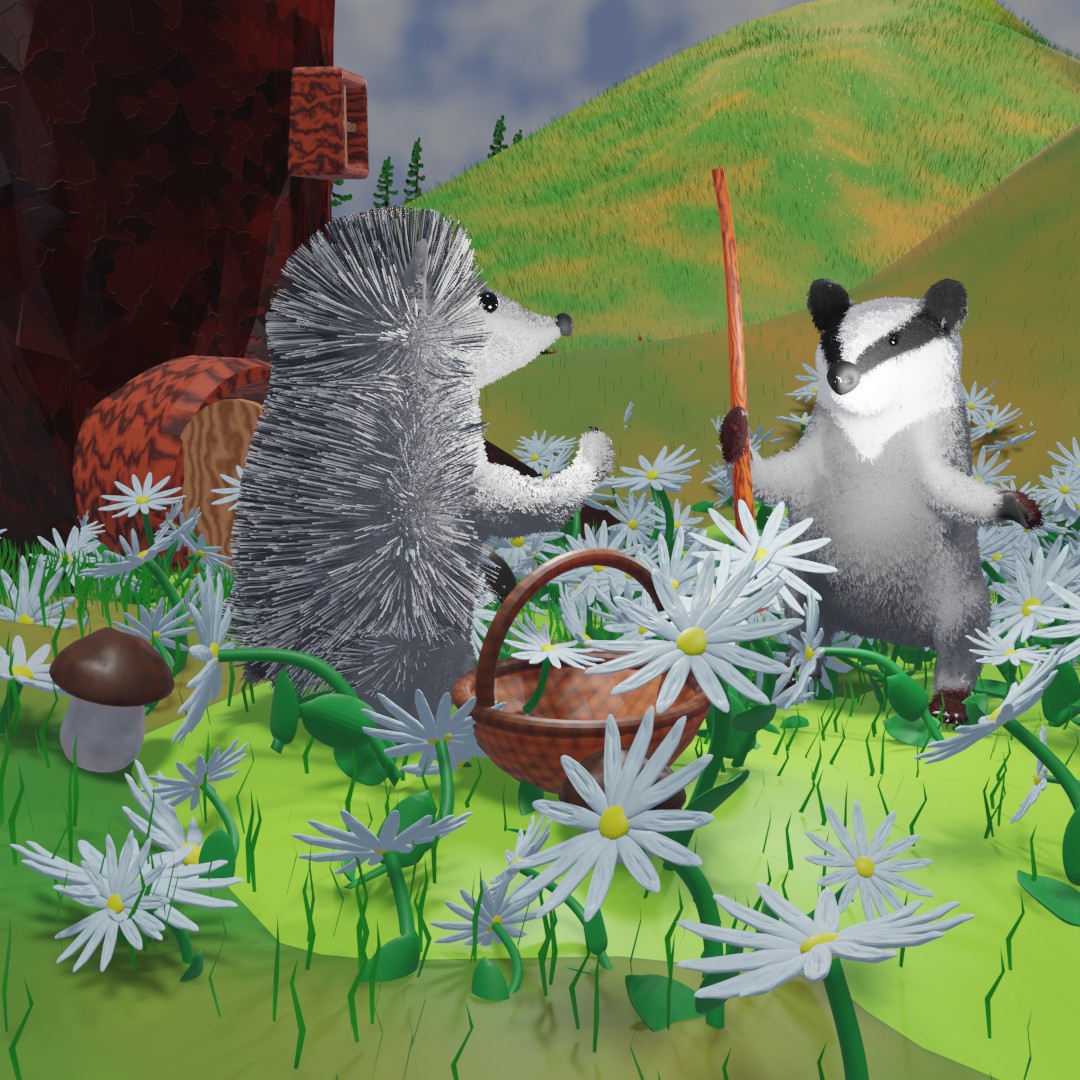 Ёжик с самого утра ходил по лесу, залезая в самую чащу, но нигде ромашки не находилось. Возвращаясь домой, зверёк решил пройти мимо домика Барсука. Тут он ещё не искал, что и не удивительно: Барсук был очень ворчливым и недружелюбным, и не хотелось лишний раз с ним общаться. Уже на подходе Ёжик заметил странную картину: Барсук ходил вокруг дерева, где был его домик, и с каким-то кряканьем и чиханием размахивал большой палкой, а вся полянка вокруг его домика была усеяна ромашкой.