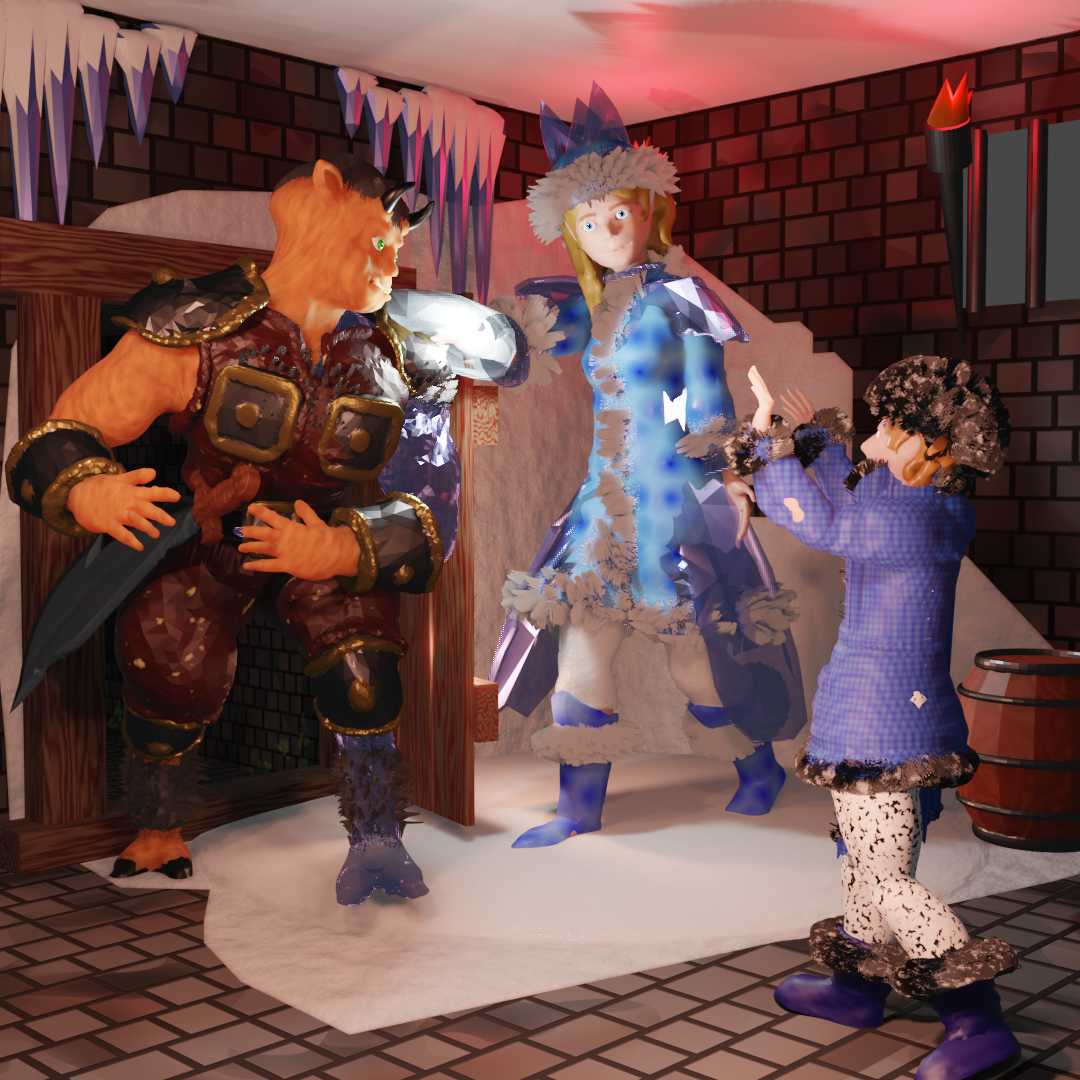 В камеру ввалились два здоровенных беса-охранника. Они несли Снегурочку. Казалось, она ещё не приходила в чувство. Они аккуратно положили её на солому, развернулись и, громко стуча по каменному полу копытами, удалились. Мелкий бес подошёл к Снегурочке, осветил её лицо, затем повернулся к Ане.