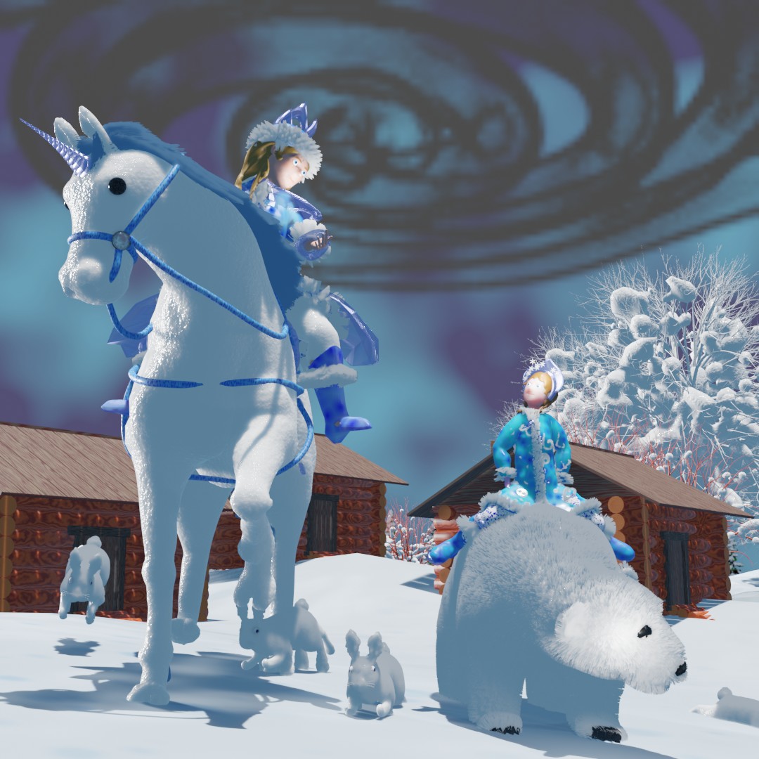 Снегурочка вскочила на лошадь. В довершении всего она погладила животной по гриве, и на лбу лошади вырос длинный витой рог, а глаза увеличились, становясь немного мультяшными.