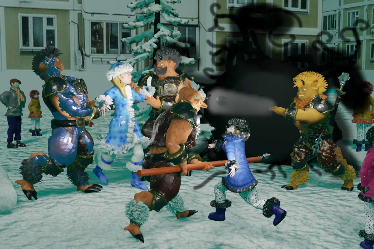 Третий раз закончиться фразу не удалось, поскольку в центре круга, где должен был появиться Дед Мороз, произошло нечто, похожее на взрыв большой чернильной кляксы: прямо в воздухе сгустилось большое чёрное пятно, которое разлетелось с легким хлопком, разбрызгивая в стороны черные завитушки, застывающие в воздухе. В середине кляксы образовалось что-то вроде ворот, через которые в центр круга влетело пятеро существ более всего похожих на медведей или орангутанов в кожаных жилетках, штанах и меховых шапках. Таких крутых спецэффектов никто не ожидал увидеть, поэтому все дети и взрослые застыли в недоумении. Пришельцы, тем временем, быстро и грубо расталкивая в стороны всех встречных, кинулись к Снегурочке.
