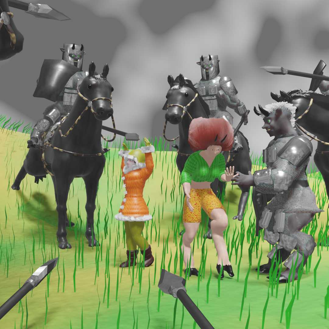 Первой их заметила Люба. Их было человек десять. Они поначалу ехали куда-то мимо. Но заметив путников, повернули коней к ним и прибавили ходу. Всадники быстро окружали их со всех сторон, так что бежать не было смыла. Да и куда бежать, если кругом, куда ни кинь взгляд, холмы, покрытые грязью? Люба с интересом и испугом смотрела на всадников, которые немало её удивили, а удивляться было чему. Во-первых, это были не люди. Они были очень похожи на средневековых рыцарей: на них были надеты блестящие чёрные доспехи, в руках копья и мечи, но вот ноги у всех заканчивались копытами, а на голове каждого воина красовались рога, причём не приставленные к шлему, а свои, собственные. Вид у воинов был крайне недружелюбный. Второе, что удивило Любу, так это то, что все копья, мечи и пики были нацелены исключительно на неё. Да-да. Она не ошиблась, как ей сначала подумалось. На Ивана никто не обращал никакого внимания. Даже два арбалетчика, которые стояли отдельно от основной группы, целились прямо ей в грудь. От этого девочке стало немного не по себе. Радовало одно – воины не нападали. Они словно бы ждали чьего-то приказа. Наконец, вперёд выехал всадник, который явно был тут главным. Лошадь его была абсолютно чёрной, за исключением кроваво-красных глаз. Доспехи всадника тоже были чёрными, но имели элементы украшения из серебра и золота. Всадник выехал вперед и властно взглянул на пленников. Черты его лица были угловаты и напоминали козлиные, но вот рога, абсолютно симметричные и тоже идеально чёрные, сразу выдавали в нём аристократа.