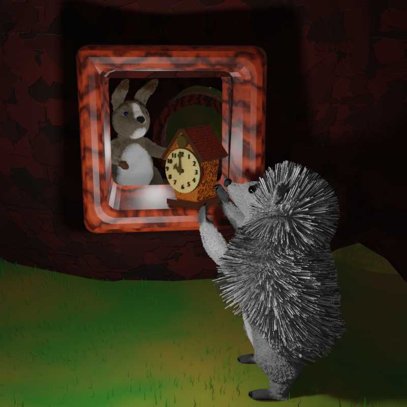 Ёжик ещё раз поблагодарил друга и вышел на улицу. Он был поражен рассказом Енота. Проходя мимо пня, Ёжик остановился. Ветер на минуту разогнал тучи, и на небе появилась полная луна. Она осветила пень, и в лунном свете тот стал казаться ещё более загадочным. Ёжик аккуратно погладил пенёк лапкой, тот был гладкий и ровный. Ёжик посмотрел на пень еще с минуту, а потом направился к домику Зайца. Там ещё горел свет. Заходить Ёжик не стал. Он постучался в окно, а когда Заяц открыл его, то поставил часы на подоконник, сказав с улыбкой: