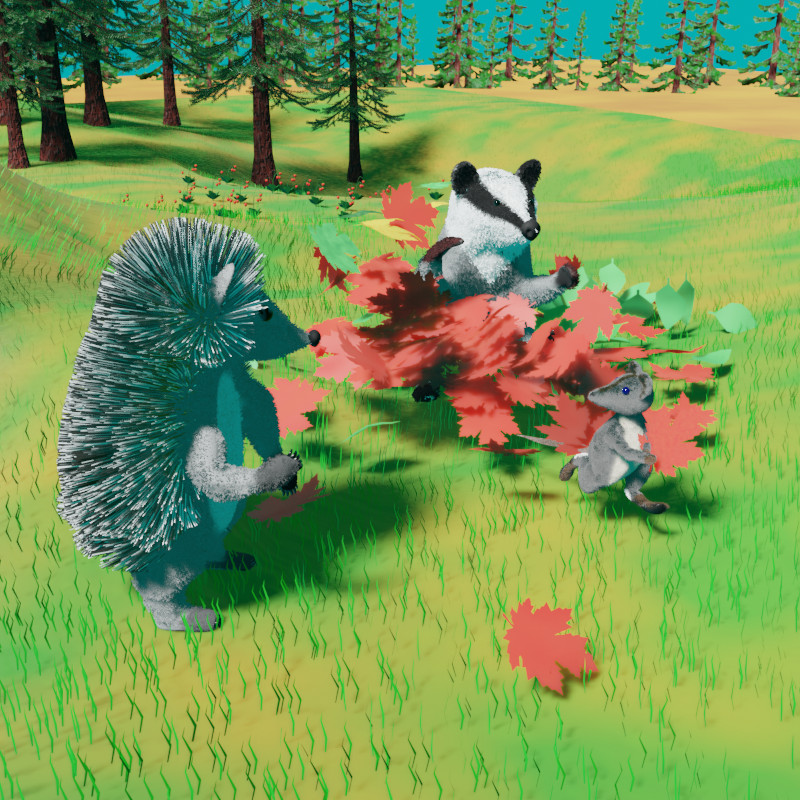 Ёжик не растерялся, он взял мешок и направился к опушке леса, где деревьев было побольше, но и там он не сразу нашел, что искал. Наконец он увидел несколько кленовых листьев и хотел было их взять, но только он наклонился за ними, откуда ни возьмись выскочила мышь, схватила листок и со словами: «Моё!», — бросилась наутёк. Ёжик даже присел от неожиданности. Поступок мыши показался ему таким странным, что он забыл даже, зачем вышел из дома. Ёжик стал смотреть по сторонам, не появится ли странная мышь, как вдруг заметил Барсука, который тащил целую охапку листьев.