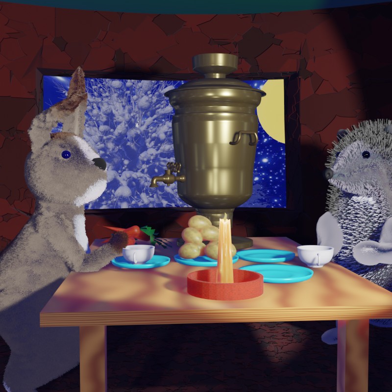 Он принёс большой самовар. Заяц налил в него воды и разжёг в топке огонь. Вскоре самовар тихонько зашипел, стали потрескивать дрова в топке.