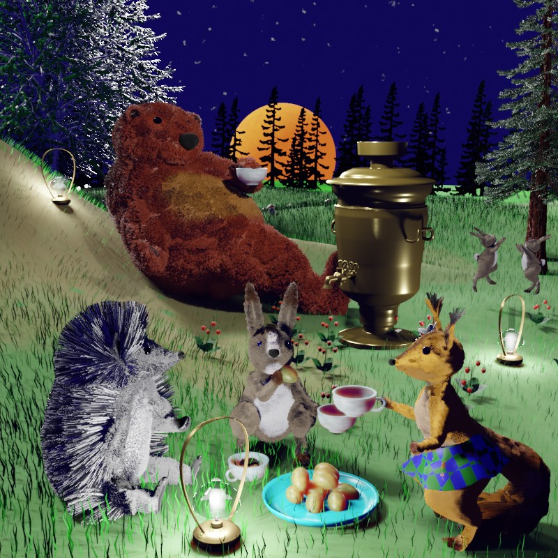 Под вечер зайчата притащили большой самовар. Все зверушки, уставшие после работы, уселись вокруг самовара и стали пить чай с мёдом, орехами и другими вкусными вещами.